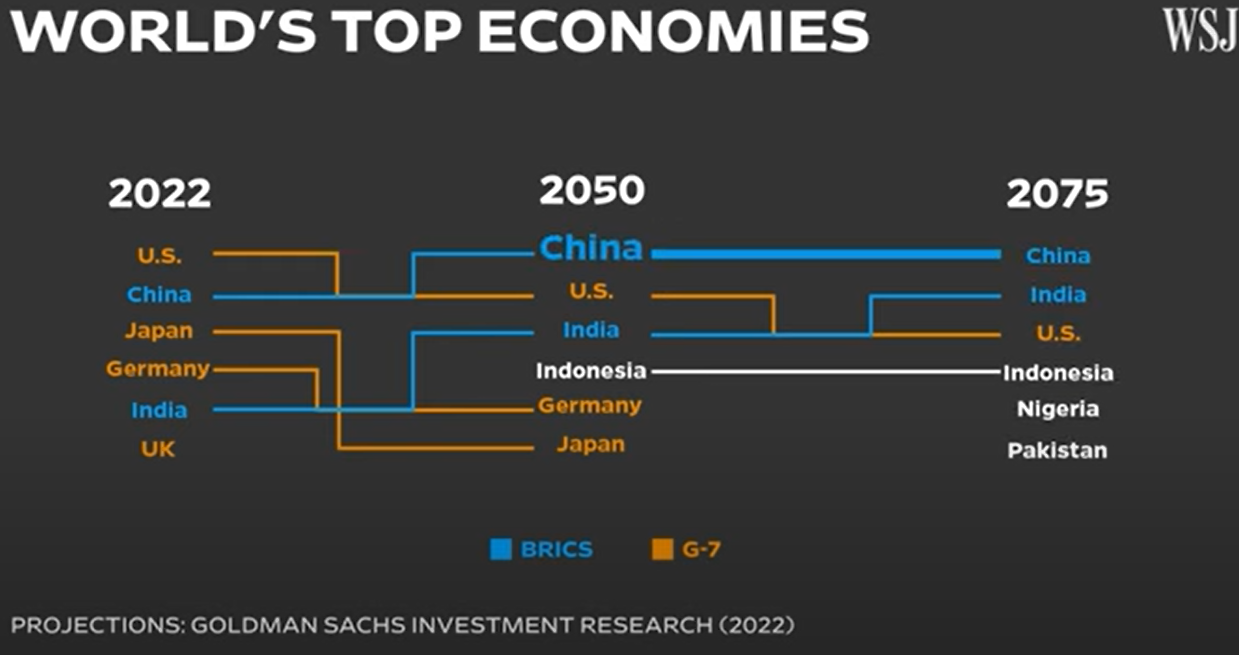 فاكر بنك جولدمان ساكس اللي هم طلعوا اسم بريكس ده؟ .. الناس دي سنة 2022 اشتغلت علي توقعاتهم علي معدلات نمو الدول النامية قصاد دول G7 .. الناس بتاعة جولدمان ساكس بتقول إن أكبر 3 اقتصاديات علي مستوي العالم سنة 2022 كانوا بالترتيب كده أمريكا وراها الصين وراها اليابان .. سنة 2075 وعليك خير حيكونوا بالتريب الصين وراها الهند وراها أمريكا .. عارف مين الدول اصحاب المراكز اللي وراهم؟ .. اندونيسيا في المركز الرابع وراها نيجيريا ووراها باكستان .. هل الكلام ده بجد ولا بلح؟ الله أعلم .. بس ده مش مهم .. المهم إننا نتكلم شوية عن الحاجة اللي مخلية البريكس سيكسي في عين الدول التانية .. حتة الحلاوة بالقشطة اللي بتخلي ريق أي بلد يجري إنه يترمي في حضن البريكس ويسيب ملاية أمريكا والحاجة دي هي بنك التطوير الجديد New Development Bank .. يطلع إيه البتاع ده؟