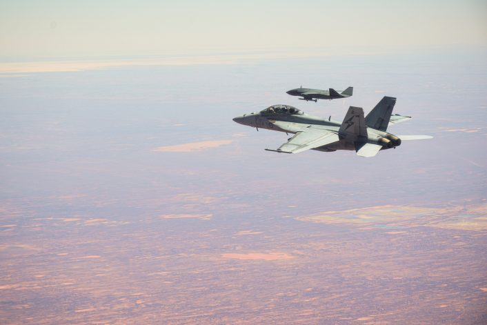 الصورة دي هي اللي بتمثل الفكرة الأساسية ورا ميلاد الطيارة بدون طيار MQ-28 Ghost Bat وهي إن طيار مقاتل علي طيارة F/A-18F Super Hornet ودي واحدة من الطيارت المقاتلة الأساسية في سلاح الجو الأسترالي يبقي طاير جنبه طيارة بدون طيار يتحكم فيها هو ويمشيها زي ما هو عايز.